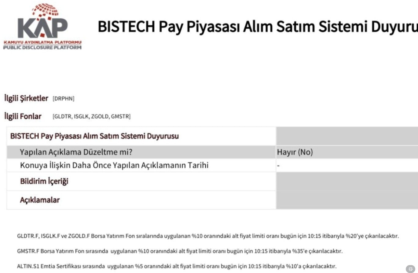 Altın ve gümüşte görülen hızlı değer kaybının ardından Borsa İstanbul’un işlem altyapısı BİSTECH, Kamuyu Aydınlatma Platformu’na (KAP) bir bilgilendirme yaptı. Açıklamada, değerli metallere dayalı bazı yatırım araçlarında uygulanan taban marjlarının (maksimum günlük düşüş limitlerinin) yükseltildiği duyuruldu.