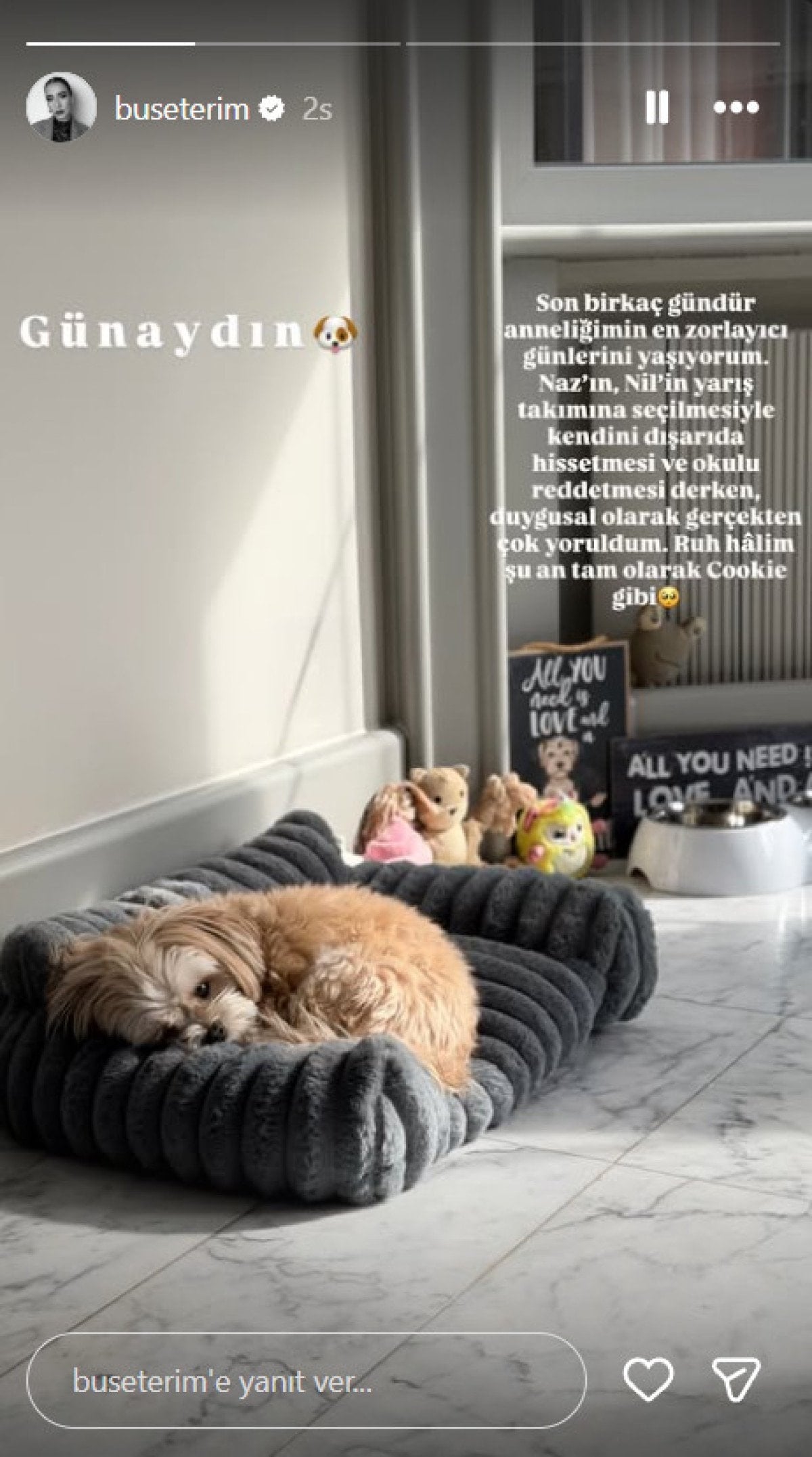 "Son birkaç gündür anneliğimin en zorlayıcı günlerini yaşıyorum. Naz'ın, Nil'in yarış takımına seçilmesiyle kendini dışarıda hissetmesi ve okulu reddetmesi derken duygusal olarak gerçekten çok yoruldum. Ruh halim şu an tam olarak Cookie gibi."
