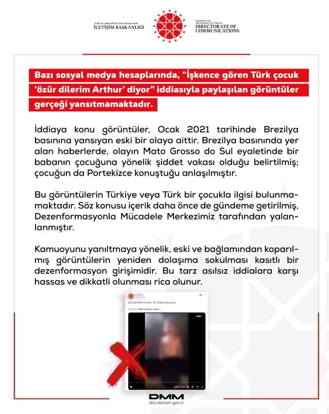 Merkez, videonun Türkiye ya da Türk bir çocukla herhangi bir bağlantısının bulunmadığını belirterek, eski ve yanıltıcı içeriklerin yeniden dolaşıma sokulmasının kasıtlı bir dezenformasyon girişimi olabileceğine dikkat çekti.