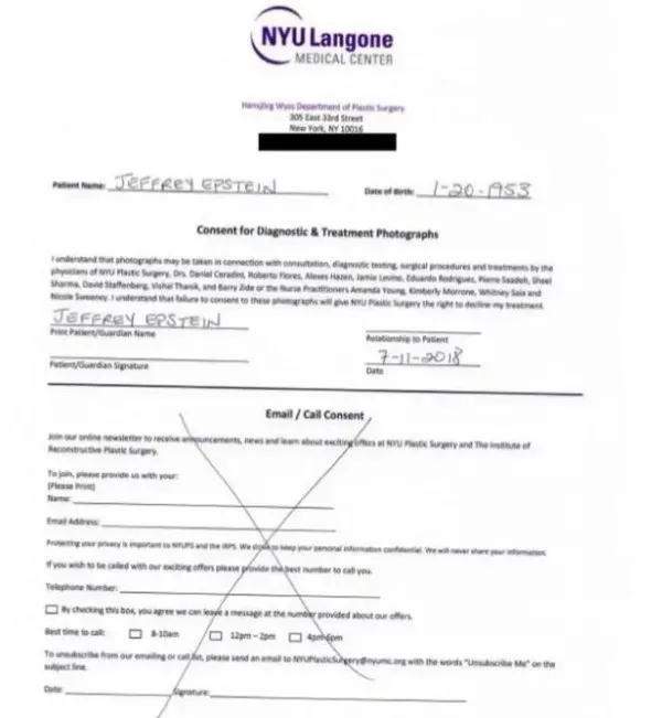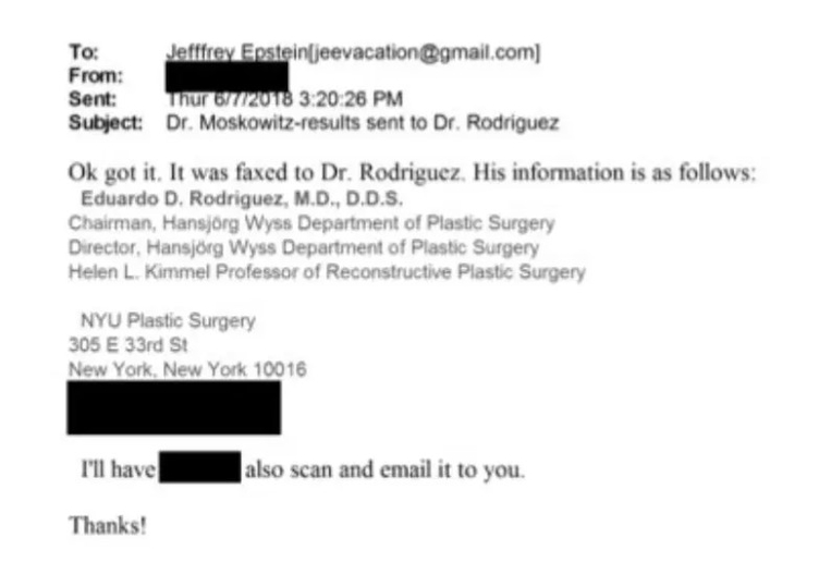 Haberde paylaşılan e-posta içeriklerine atıfla, Epstein’in uzun süreli asistanı Lesley Groff’un 10 Temmuz 2018 tarihli mesajında, ertesi gün saat 09.00 için New York’taki NYU Langone Hastanesi’nde bir randevu ayarlandığını yazdığı öne sürüldü. Dr. Rodriguez’in halen bu hastanede plastik cerrahi bölümünün başında olduğu da aktarıldı.