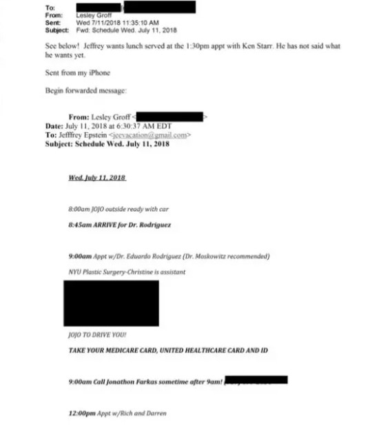 Bir başka iddiaya göre aynı gün paylaşılan programda, sabah saatlerinde Dr. Rodriguez ile görüşme; öğleden sonra ise hukukçu Kenneth Starr ile planlanan bir öğle yemeği yer aldı. E-postada “JoJo sizi götürecek. Sağlık kartınızı ve kimliğinizi almanız gerek” ifadesinin bulunduğu; “JoJo”nun da Epstein’in ev çalışanlarından biri olduğu ileri sürüldü.